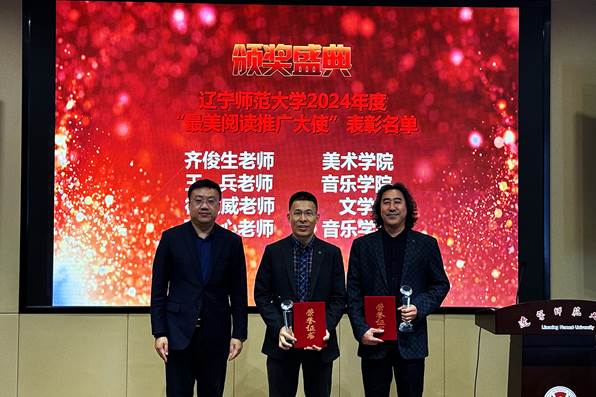 闭幕式以短片的形式,回顾了本年度读书季以“承神州泱泱文化,展时代熠熠华章”为主题,以“贯彻落实习近平文化思想,建设最美书香校园”为内涵,以“文化羁旅、文化光华、文化律动、文化神采、文化赓续、文化华章”六大篇章为主线,开展的一系列形式多样、格调高雅、书香浓郁的读书活动,为师生读者提供了一场场文化盛宴和精神洗礼,得到全校上下广泛关注与好评。冯博宣读辽宁师范大学2024年度“最美阅读推广大使”表彰名单,并为获奖代表齐俊生、王兵两位老师颁发奖杯和证书。