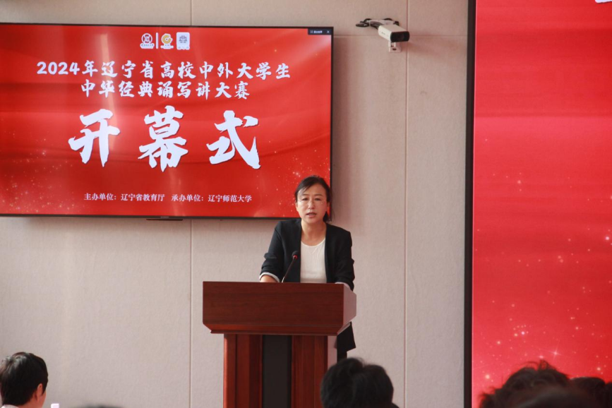 我校文学院副院长王虎教授介绍比赛规则,并介绍参赛人员人数和组别。同时,他预祝各位参赛选手取得优异成绩、大赛圆满成功。大连大学孙惠欣教授强调了本次大赛对于推动中华传统文化的传承发展以及中华优秀传统文化对外交流起着至关重要的作用。她鼓励同学们能够在竞技与交流中深入感受中华优秀传统文化的博大精深。通过诵读经典诗词、书写优美汉字、讲解文化内涵等形式,选手们能将中华传统文化的魅力传递给更多的人,促进传统文化在新时代绽放生机。我校文学院院长洪飏教授对本次开幕式发表了总结致辞。她表示,评审团将会始终坚持“公平、公正、公开”的原则,为大赛营造出一个积极健康、充满活力的竞争氛围。随后,她宣布,2024年辽宁省高校中外大学生中华经典诵写讲大赛开幕式圆满结束。