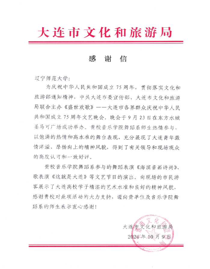 近日,由中共大连市委宣传部、大连市文化和旅游局联合主办的《盛世欢歌》——大连市各界群众庆祝中华人民共和国成立75周年文艺晚会在东方水城圣马可广场成功举办。晚会上,我校音乐学院舞蹈系师生参与表演的舞蹈《海滨音画诗尚》、歌舞《这就是大连》等节目,以饱满的热情和精湛的艺术表现,向现场市民游客展现了辽师学子过硬的专业素养和热情向上精神面貌,得到了有关领导和现场观众的一致好评,并收到主办方发来的感谢信。