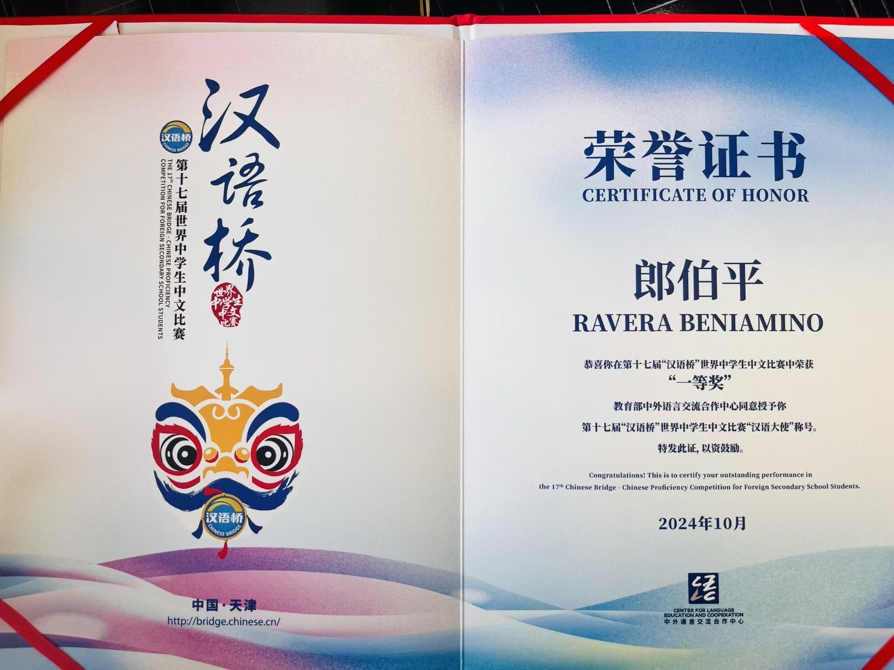 10月28日,由教育部中外语言交流合作中心主办的第十七届“汉语桥”世界中学生中文比赛和第四届“汉语桥”世界小学生中文秀总决赛暨颁奖仪式在天津举行。来自102个国家的181名中小学生共同参加了这场全球性的中文“奥林匹克”。我校意大利米兰国立大学孔子学院选手郎伯平以优异的表现荣获一等奖,并被教育部中外语言交流合作中心授予“汉语大使”称号。