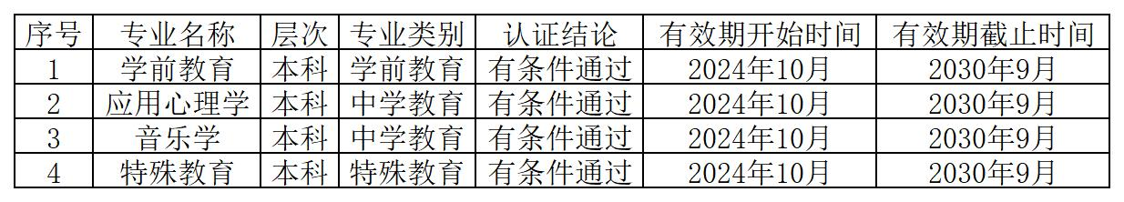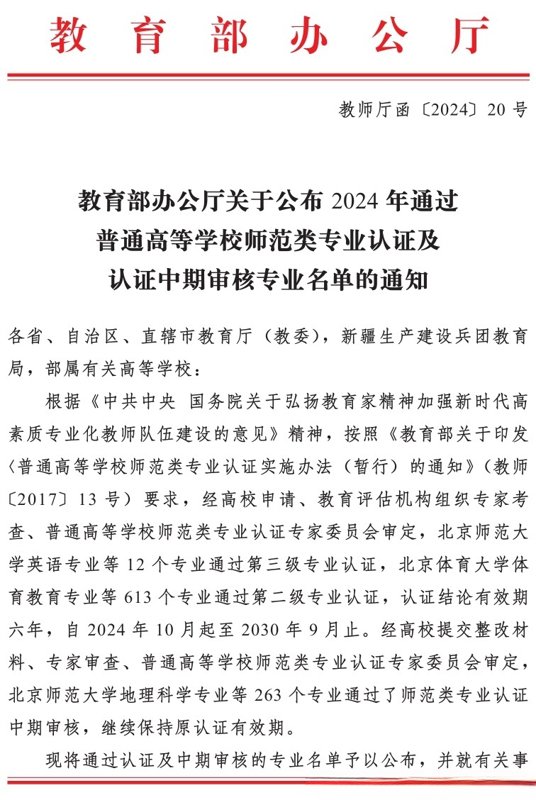 近日,教育部印发《教育部办公厅关于公布2024年通过普通高等学校师范类专业认证专业名单及中期审核专业名单的通知》(教师厅函〔2024〕20号),我校学前教育、应用心理学、音乐学、特殊教育4个专业通过中学教育第二级专业认证,认证结论有效期6年,自2024年10月起至2030年9月止;地理科学、生物科学、心理学、化学4个专业通过中期审核,继续保持认证有效期,自2021年9月起至2027年8月止。目前,我校23个师范专业中已有17个专业通过师范类专业第二级认证,2个专业完成第二级认证进校考查,6个专业通过中期审核,做到了应认尽认。