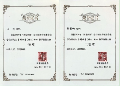 11月15日-17日,由江苏师范大学承办的2024年全国“田家炳杯”全日制教育硕士专业学位研究生学科教学(语文)专业教学技能大赛决赛落下帷幕。经过专家对初赛学生提交作品的评审,本次大赛决赛共有来自北京师范大学、华东师范大学、东北师范大学等126所高校的176名选手入围。在决赛阶段,通过教学设计、课件制作、模拟授课和现场答辩等环节的激烈比拼,我校文学院2023级学科教学(语文)专业两名研究生凭借扎实的基本功、精湛的教学技能和稳定的发挥,斩获佳绩,其中王川获大赛一等奖并作为唯一一名获奖学生代表发言,徐胜楠获二等奖。郑艳老师获评大赛优秀指导教师。