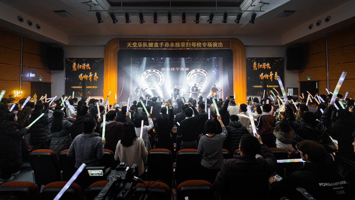 演出中,天堂乐队带来了《幸福的花儿》《摇滚这个夜晚》《湖水》《赵家老哥》《少年》《永远年轻》《老谁小谁》7首歌曲,其中《湖水》《少年》邀请现场观众同台互动演唱。礼堂内气氛热烈,同学们挥舞手中的荧光棒,感受摇滚乐中积极向上的生活态度和自由热烈的精神力量。