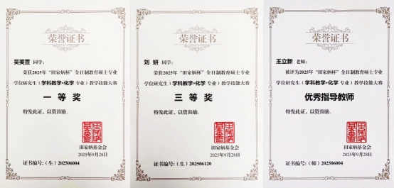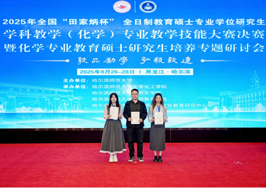 近日,2025年全国“田家炳杯”全日制教育硕士学科教学(化学)专业教学技能大赛决赛在哈尔滨师范大学圆满落幕。我校化学化工学院学科教学(化学)专业2024级研究生在本次大赛中凭借扎实的专业知识、优异的教学技能及沉稳的发挥,取得突破,首获大赛该学科领域一等奖。其中,来自首届“卓师班”的吴美萱同学和刘妍同学分别获大赛一等奖和三等奖;王立新老师荣获“优秀指导教师奖”。