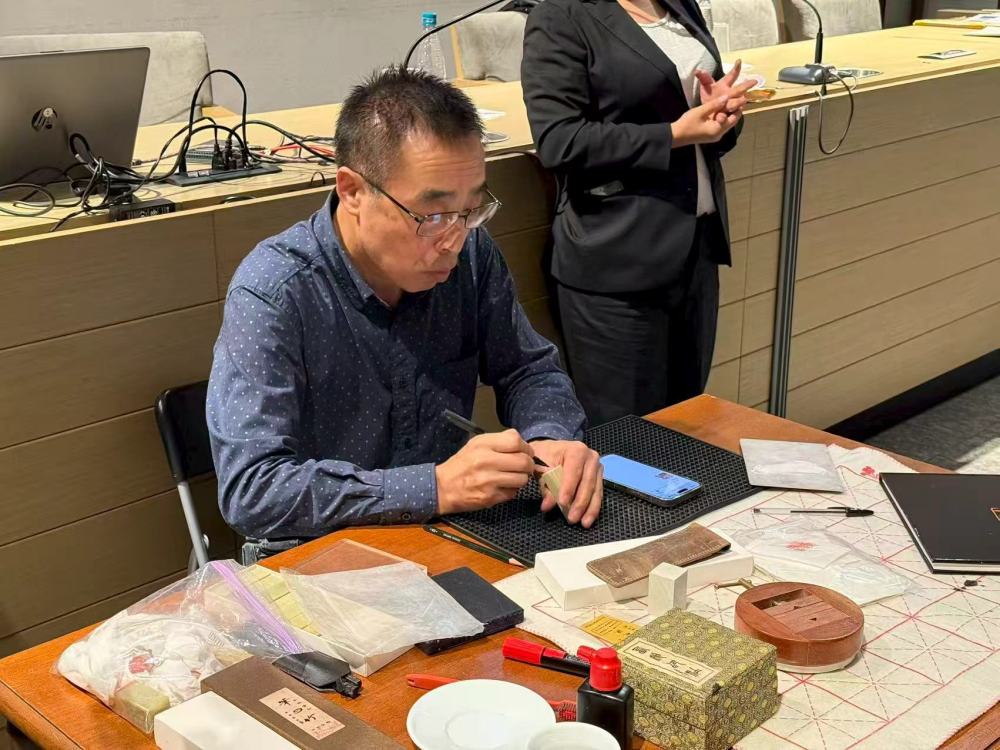 首日讲座中,慕德春以《方寸之间的艺术诗:篆刻艺术的发展历史》为题,系统讲解篆刻的起源、发展脉络与艺术价值,介绍基本工具与技法,并借助丰富图片资料和历史实例,带观众领略从秦汉印玺到明清流派的篆刻演变与文化传承。讲解后,他现场演示篆刻,为热爱书法的外国友人刻中文名字印章并赠予对方,赢得热烈掌声。