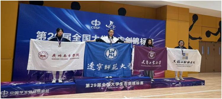 首征即巅峰。外语学院关欣玥、国际商学院陈芃、陈芄同学努力拼搏,过关斩将最终取得女子甲组重剑个人赛冠军、女子甲组佩剑个人赛第六名和女子甲组佩剑团体第六名的傲人战绩。本次大赛不仅展示了辽宁师范大学学子的高水平竞技能力,竞赛中顽强拼搏的状态和激昂的斗志,同样也展示了他们“更快、更高、更强、更团结”的运动精神,祝贺运动健儿们,期待他们在未来突破自我,为师大再创佳绩!