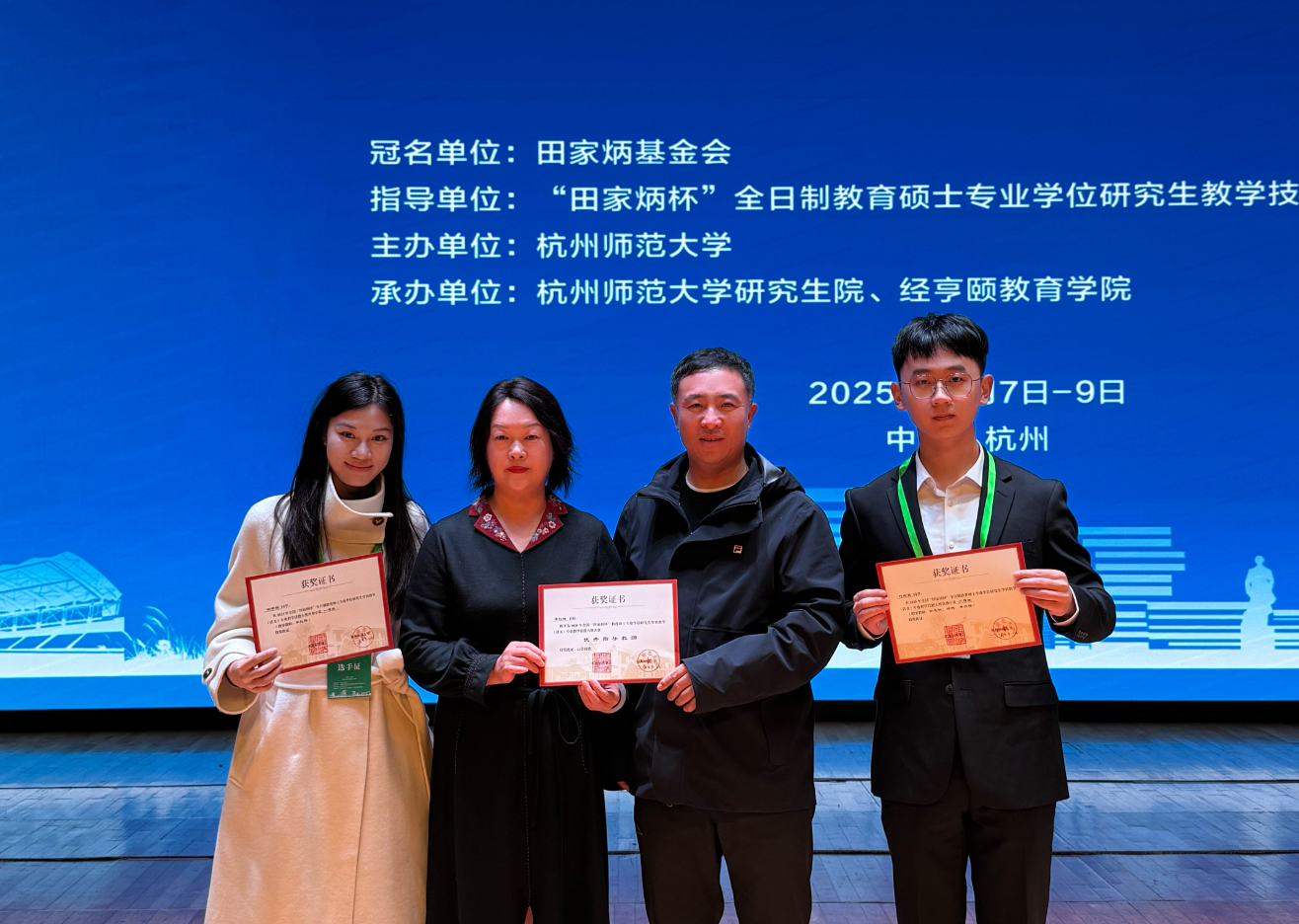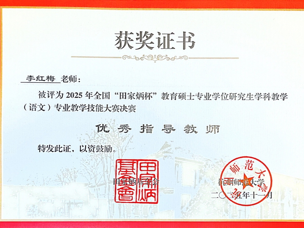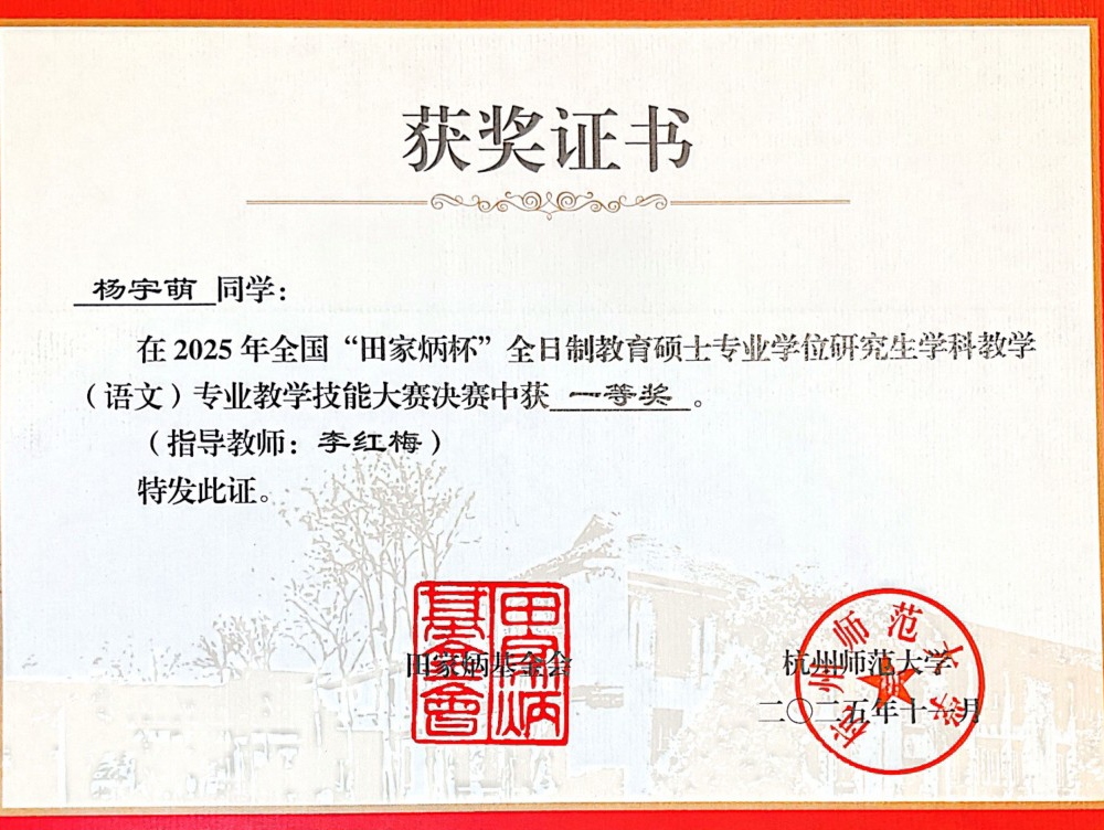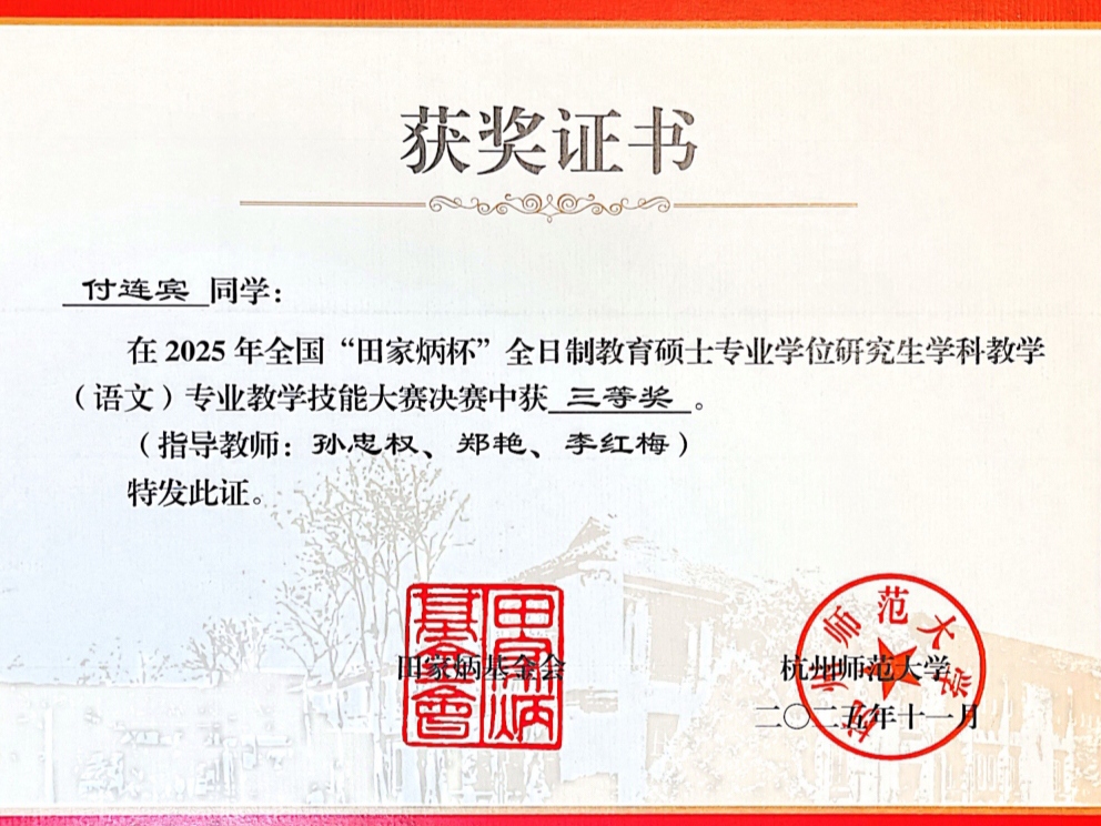 2025年全国“田家炳杯”全日制教育硕士专业学位研究生学科教学(语文)专业教学技能大赛决赛于11月9日在杭州师范大学圆满落幕。我校文学院2024级学科教学(语文)专业研究生杨宇萌、付连宾凭借扎实的专业功底和出色的赛场表现脱颖而出,分别荣获国家级一等奖、三等奖,李红梅老师获评“优秀指导教师”称号。