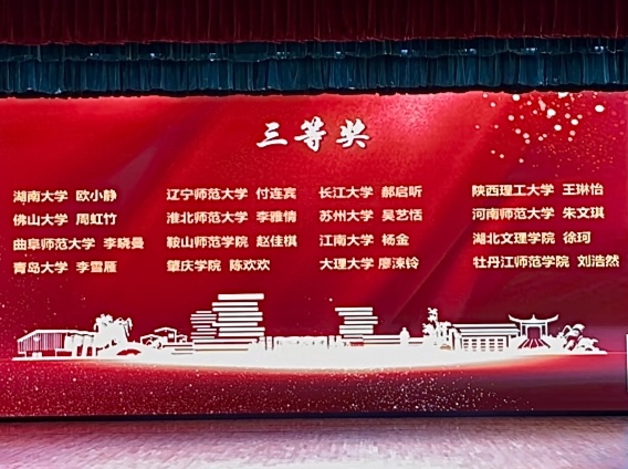 赛场上,各校选手全力以赴、各展风采。文学院学子沉着应战、精心展示,充分展现了辽师文学院研究生过硬的专业素养和良好的从师潜力,最终不负众望斩获佳绩,杨宇萌同学在李红梅老师的悉心指导下稳定发挥,夺得一等奖;付连宾同学在孙忠权老师的细致指导下稳步推进,斩获三等奖。