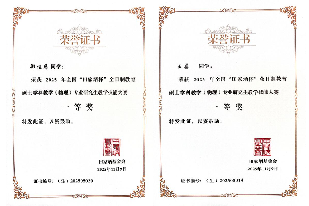 近日,2025年全国“田家炳杯”学科教学(物理)专业研究生教学技能大赛决赛在华南师范大学圆满落幕,物理与电子技术学院2024级学科教学(物理)专业研究生郑佳慧、王荔双双荣获国家级一等奖,王震、杨硕两名教师获评“优秀指导教师”。