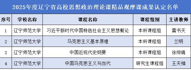 近日,辽宁省教育厅公布了2025年度省高校思想政治理论课精品观摩课成果认定结果。我校马克思主义学院雷书天、兰明、徐绯璐、王天楠四位教师主讲的课程,凭借先进的教学理念、扎实的教学功底和突出的育人成效,成功获评为省级精品观摩课,是我校思想政治理论课教学质量持续提升的又一重要体现。