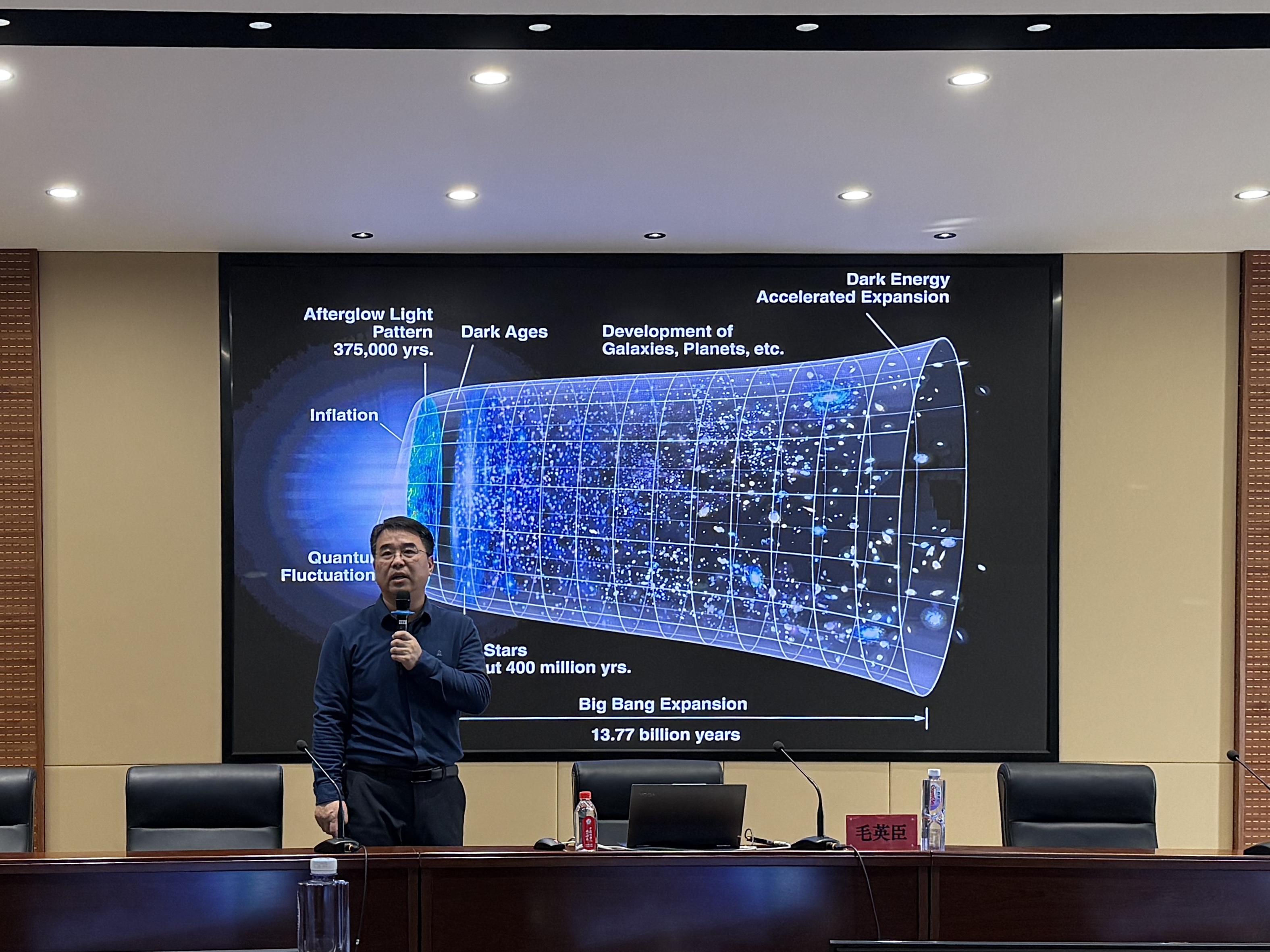 从10亿光年外的星系团开始,毛老师逐步拉近视角,历经璀璨的银河系、炽热的太阳系,最终聚焦到我们赖以生存的地球,乃至人类自身。他介绍道,宇宙年龄约138亿年,直径至少138亿光年,我们观测到的十亿光年外天体之光,实则是其十亿年前的遗存,这一跨越时空的认知,让大家对宇宙的浩瀚有了更为直观的感受。