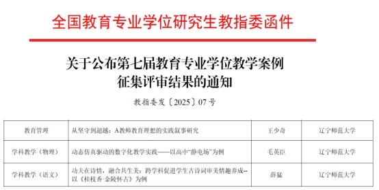 近年来,学校高度重视专业学位案例库建设和案例教学工作,将其作为新时代专业学位研究生教育改革的重要突破口。2025年,学校精心组织开展校级研究生教学案例建设工作,共有21项校级案例顺利结项,为国家级案例库输送了优质资源。本次案例成功入库,不仅为我校教育硕士等专业学位人才培养模式创新注入新动力,也激励教师深入开展案例研究与撰写,积极将案例教学融入课堂实践。今后,学校将进一步加大支持力度,推动已入库案例在专业学位教育教学中的广泛应用,逐步构建具有辽师特色的案例教学体系,持续提升专业学位研究生培养质量。