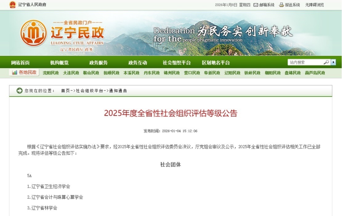 1月4日,辽宁省民政厅在其官网发布了《2025年度辽宁省社会组织评估等级公告》,经省社会组织评估委员会评审确定并公示,辽宁省辽宁师范大学教育基金会在2025年度辽宁省社会组织评估中,再次获评“辽宁省4A级社会组织”称号。