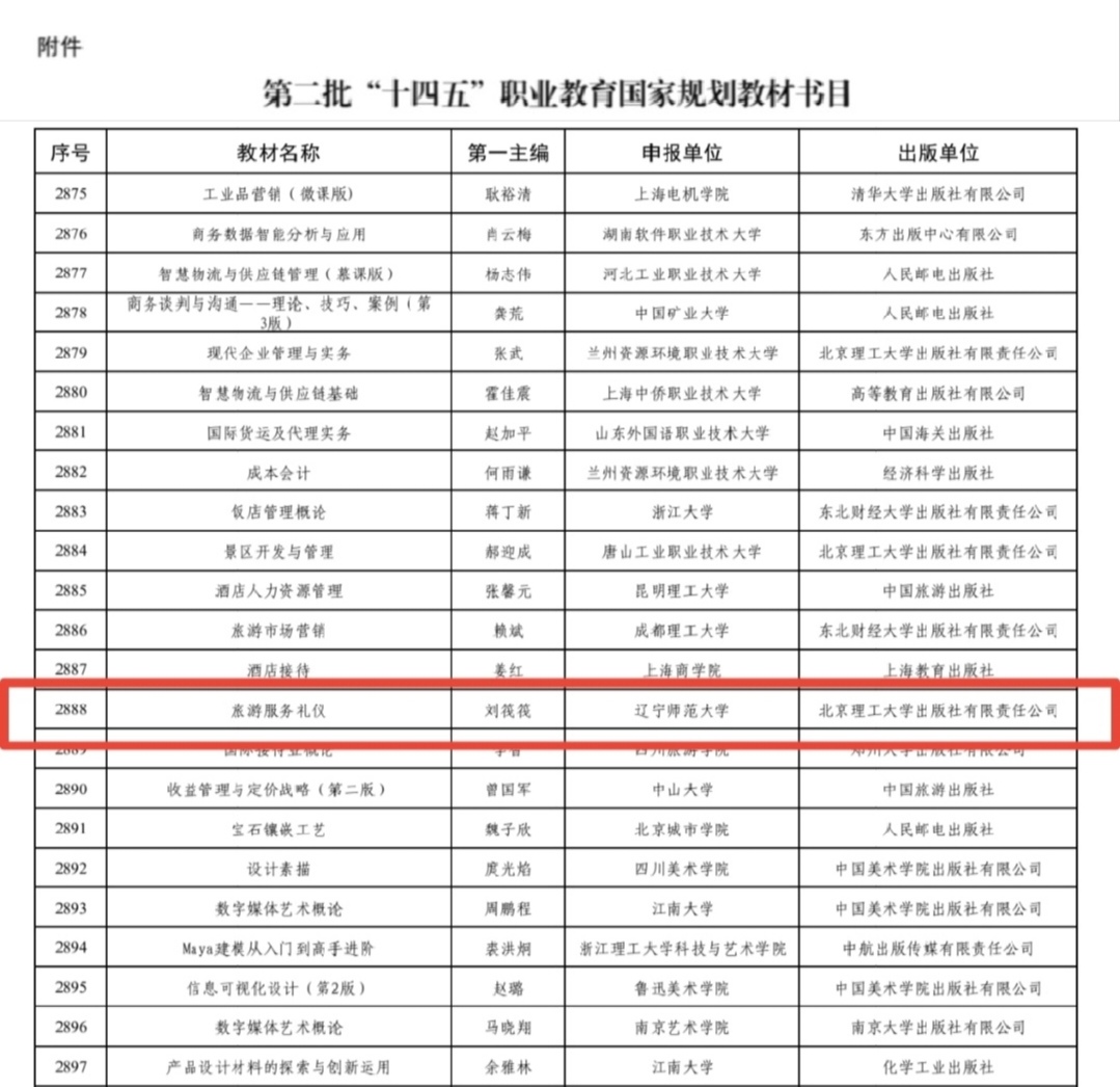 近日,教育部公布了第二批“十四五”职业教育国家规划教材书目,我校教师刘筏筏主编教材《旅游服务礼仪》成功入选。这是我校在旅游服务类课程建设与教材开发方面取得的重要成果,也反映出学校持续推进教育教学改革、深化产教融合工作的显著成效。
