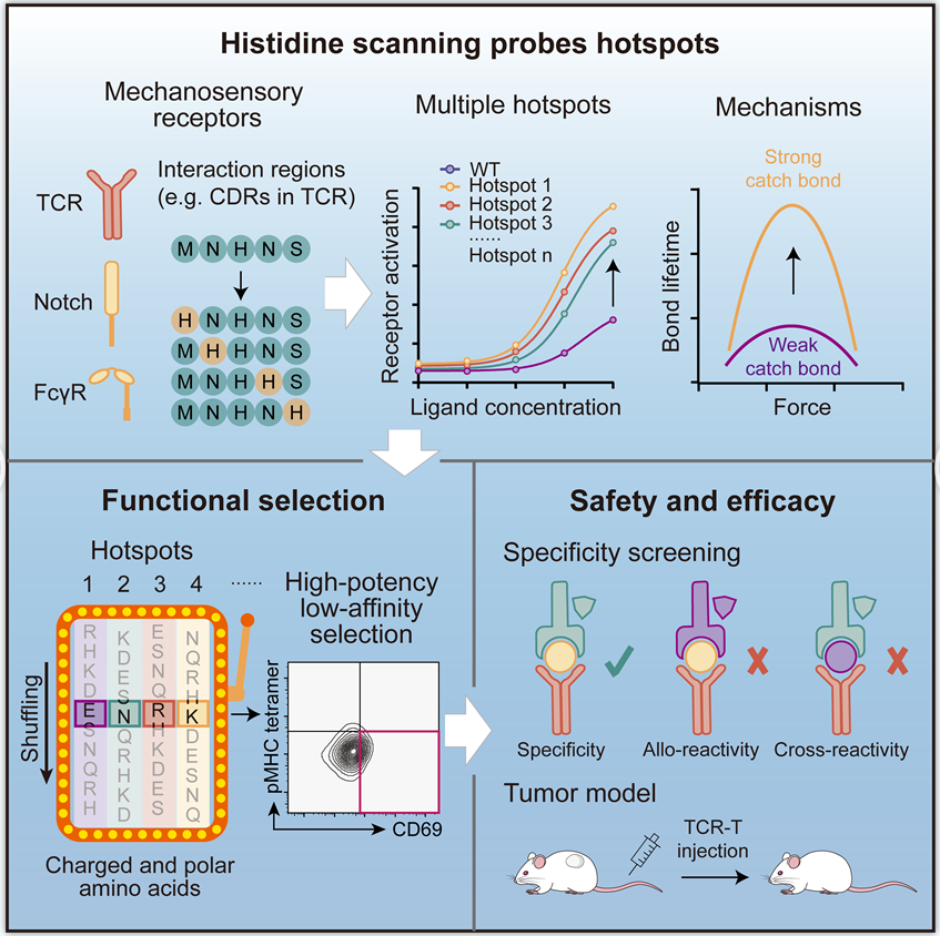 本研究聚焦于TCR作为机械感受受体的独特生物物理特性,提出并系统验证了一种全新的通用策略——组氨酸扫描(histidine scanning)。实验合作者发现,通过在TCR的互补决定区(CDR)中引入单点组氨酸突变,可高效识别一组关键“热点”位点,这些位点能够促进 TCR 与 pMHC 在受力条件下形成逆锁键(catch bond),从而显著增强 TCR 的力学信号转导能力和整体功能效力。进一步地,这些热点位点可用于构建 TCR 文库,从中筛选获得低亲和力但高效力的 TCR 突变体,在保持强抗肿瘤活性的同时,有效避免脱靶毒性和靶向非肿瘤组织毒性。