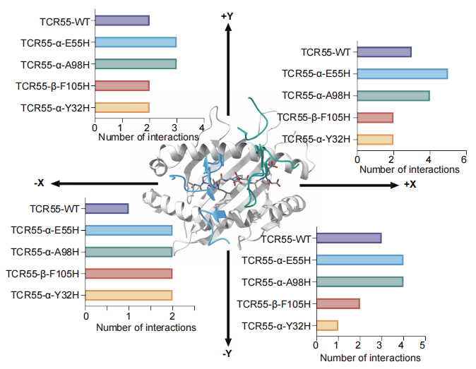 基于上述实验发现,化学与生物学交叉研究中心团队通过理论计算,利用分子动力学模拟及相互作用统计分析,从原子水平揭示了组氨酸突变体在受力剪切过程中如何促进新的氢键和盐桥形成,重塑 TCR-pMHC 界面的瞬时相互作用网络,从而增强逆锁键强度。理论计算结果进一步表明,逆锁键形成能力与 TCR 突变体信号强度及功能效力具有显著相关性。这些计算结果为实验观测到的 TCR 功能增强提供了清晰的分子机制解释,充分体现了化学与生物学深度交叉融合的研究特色,为安全有效的 TCR-T 细胞治疗提供了重要的理论支撑。
