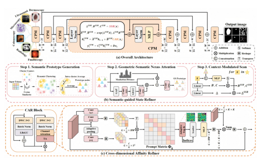 该研究聚焦视觉状态空间模型(Mamba)在医学图像分割中的关键挑战,主要包括语义信息与几何结构之间的表征错配,以及诊断线索在空间维度与通道维度交织时带来的建模困难。针对上述问题,论文提出GeoSemba框架,从状态空间方程的角度出发,对特征信息流进行系统性重构。框架中,语义引导的状态细化器(SSR)在原始特征上构建语义原型,并通过自适应方式重参数化状态更新所需的关键分量,同时显式融合空间几何关系,使模型能够兼顾组织纹理语义与结构边界轮廓,从而提升对细长结构、模糊边界与小目标的刻画能力。与此同时,跨维亲和细化器(CAR)采用“宏观感知、微观聚焦”策略,对空间与通道的依赖关系进行分层建模,并在状态更新前注入贡献感知的Top-K亲和聚合机制,强调关键区域与关键通道的响应,有效抑制噪声干扰并避免冗余关联带来的信息淹没。研究团队在覆盖六类医学模态的数据集上对方法进行了全面验证,结果表明GeoSemba在精度指标上取得稳定提升,同时在参数量与推理速度等效率指标上保持良好表现,从而为复杂医学影像场景中细粒度结构与病灶的鲁棒分割提供了一条兼顾性能与效率的可行路径。