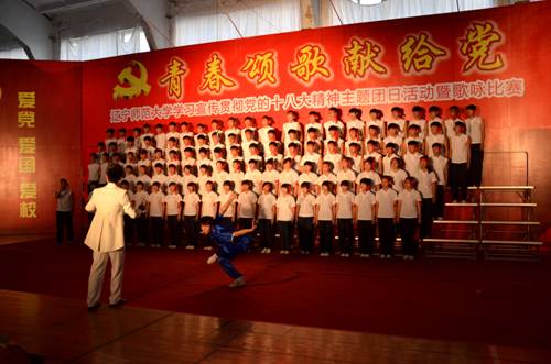 首先上场的是来自影视艺术学院的同学们,他们用一首《保卫黄河》震撼了全场;计算机与信息技术学院带来的《歌唱祖国》,教育学院的合唱《中国军魂》、化学化工学院带来的《我的祖国》、数学学院的合唱《中国中国鲜红的太阳永不落》都表达了对祖国母亲深深的热爱;体育学院带来的《众人划桨开大船》,豪气冲天的气势再一次将全场的气氛带到高潮,合唱中穿插的精彩的武术表演震撼了全场的观众,师生们掌声不断。