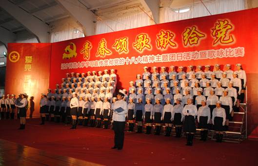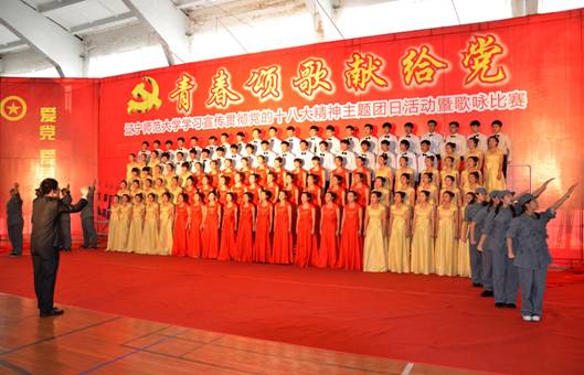 12月7日14时30分,我校“青春颂歌献给党”学习宣传贯彻党的十八大精神主题团日活动暨歌咏比赛在黄河路校区南院篮球馆举行,全校2000余名师生共同参加了活动。本次活动由校团委主办,音乐学院、体育学院和校学生社团联合会承办。校党委副书记刘群、宣传统战部部长王建平、工会主席张学军、团委书记王维以及各二级学院党总支副书记、团委书记、辅导员出席了活动。音乐学院副院长刘世虎,音乐学院教师金梅、叶蔚、李金波、李芳屹担任了比赛评委。