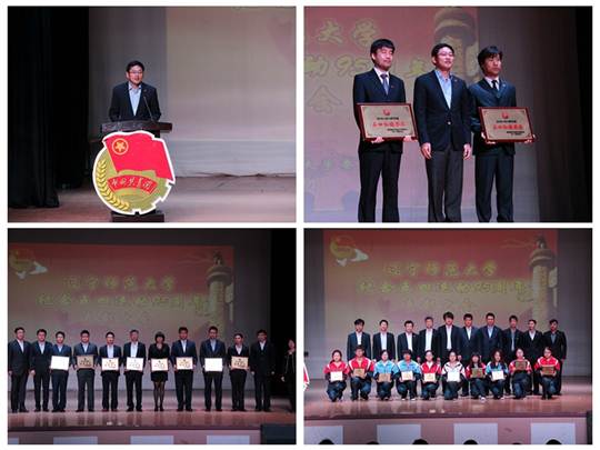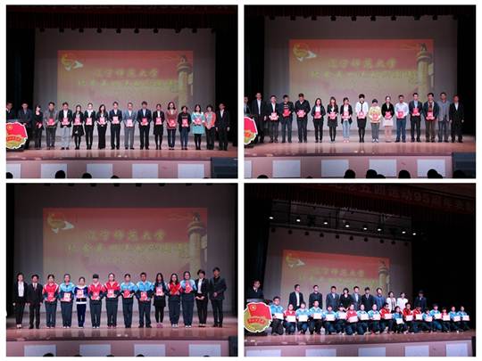 为庆祝中国共产主义青年团成立92周年、“五四”运动95周年,并表彰过去一年来在我校共青团系统涌现出的先进集体和个人,共青团辽宁师范大学委员会于2014年4月25日上午10点,在西山校区影视艺术学院礼堂隆重召开“五四”表彰大会。校团委书记、校青年联合会主席王维,校青年联合会五位副主席:校务办公室副主任宁芳、学生处副处长杨智国、保卫处副处长刘宏兵、张军、大连市青联委员郑艳出席了表彰大会。同时,大连市首届“我最喜爱的青年教师”马治国、各二级学院团委书记、受表彰青年教师、青年岗位能手等也参加了此次大会。本次大会由校团委组织部部长隋京欣主持。
