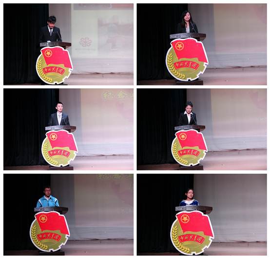 先进集体代表、政治与行政学院团委书记佟金泽,“十佳团支部”代表、化学化工学院2011级1班团支部聂颖,“师大榜样”之优秀青年教师代表、心理学院专业教师高雯,“师大榜样”之青年岗位能手代表、校务办公室文字秘书杨帅,“师大榜样”之优秀大学生代表、历史文化旅游学院2012级历史学(师范)专业学生马耀东,自立自强大学生代表、数学学院研究生周锦华依次上台发言。