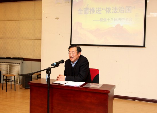 11月13日下午,法学院在西山校区2号教学楼多功能教室举办了“全面推进依法治国”为题的学术讲座。全院教师和全体研究生及部分本科生参加了讲座。讲座由法学院院长丁慧教授主持,法学院博士生导师于沛霖教授、顾瑞博士分别作了题为“全面推进依法治国的总目标”和“依法治国的基本格局及战略部署”的学术报告。于沛霖教授深度解读了全面推进依法治国的总目标,即建设有中国特色的社会主义法治体系,建设社会主义法治国家是全面推进依法治国工作的重点和总抓手,是四中全会决定的灵魂。他重点阐释了社会主义法治体系这一新提法的科学内涵,并对五个子体系作了具体说明。顾瑞博士对四中全会决定从目前法治工作基本格局出发,对科学立法、严格执法、公正司法、全民守法的论述和部署作了全面解读。他以法理学的法治的运行理论,结合我国法治实施的实际,全面、深入、具体地阐释了全面推进依法治国的若干新举措。两位主讲人报告之后,法学院韩秀义教授结合自己的学习体会作了精彩的点评。随后,进行了学术互动,有多位研究生现场提出问题,由两位主持人分别作了回答。